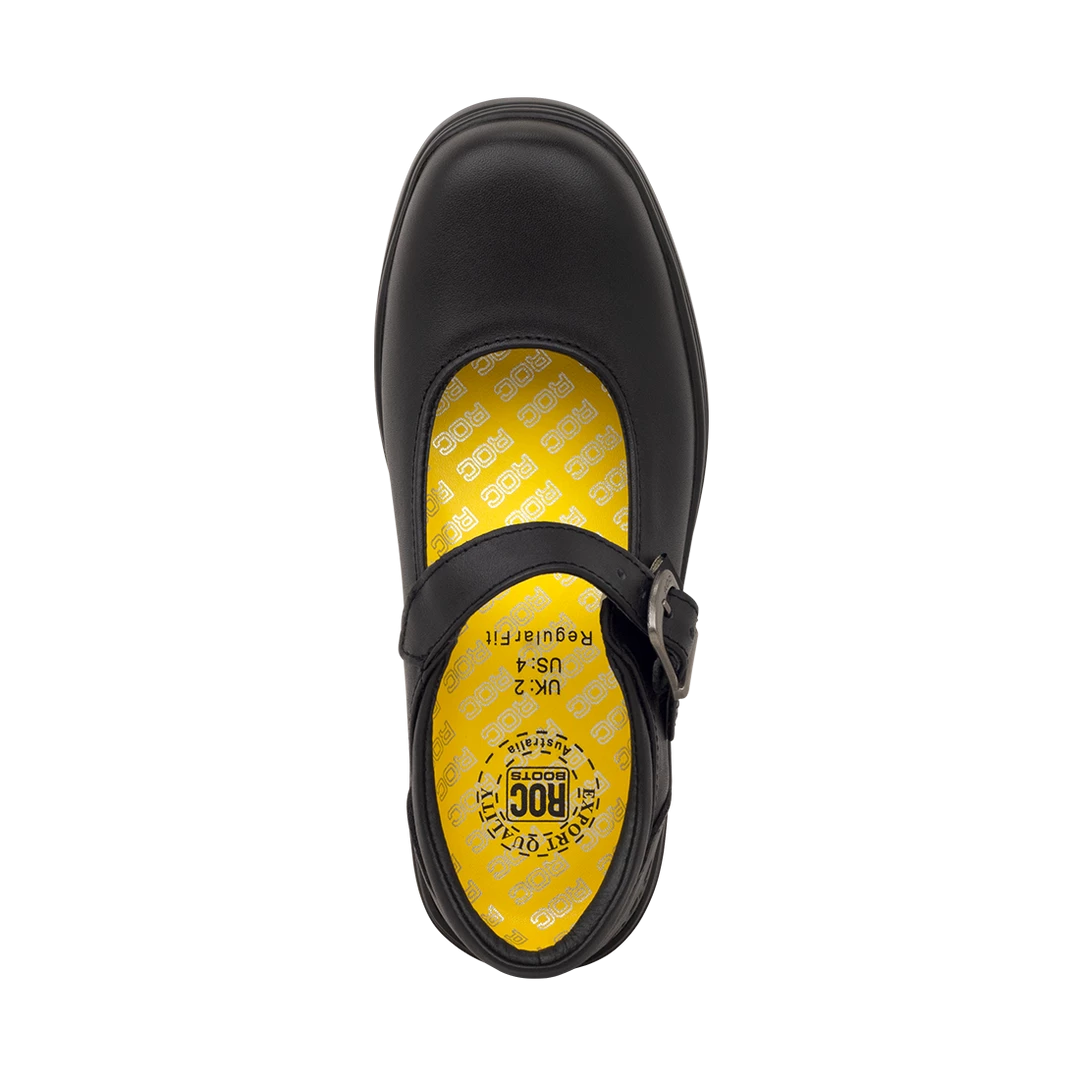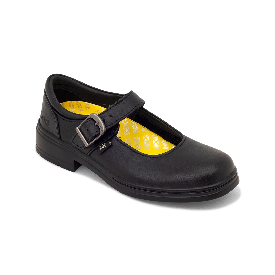 A classic Mary-Jane buckle up with a padded collar for ample cushioning and support. Offers maximum durability and breathability. Flexible full grain leather upper and lining. Light weight, long wearing PU outsole.